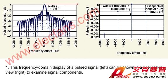 为了查看一个脉冲调制信号的频率响应的频谱是什么样子,我们首先从数学上分析时域响应。公式1给出了一个脉冲调制信号的时域关系。它的产生步骤是首先建立一个用脉宽为PW的矩形窗加窗的信号。然后产生一个Shah函数,这个函数包含一个间隔为1/PRF的周期脉冲序列,其中PRF是脉冲重复频率。这也同可以看作是间隔和脉冲周期相等的脉冲。而后加窗信号和Shah函数卷积,产生一个和脉冲调制信号相应的周期脉冲串: