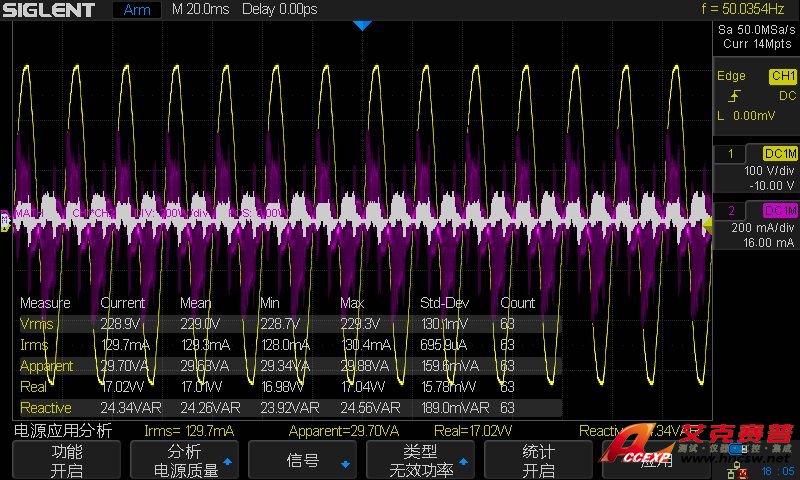 为验证负载的实际功率。我们把SDM3065X作为电流表接入到负载电路中,如图6所示;同时把高压差分探头和电流探头接入到负载电路中。在功率分析中,选择电压均方根、电流均方根、有效功率。结果如图7所示: