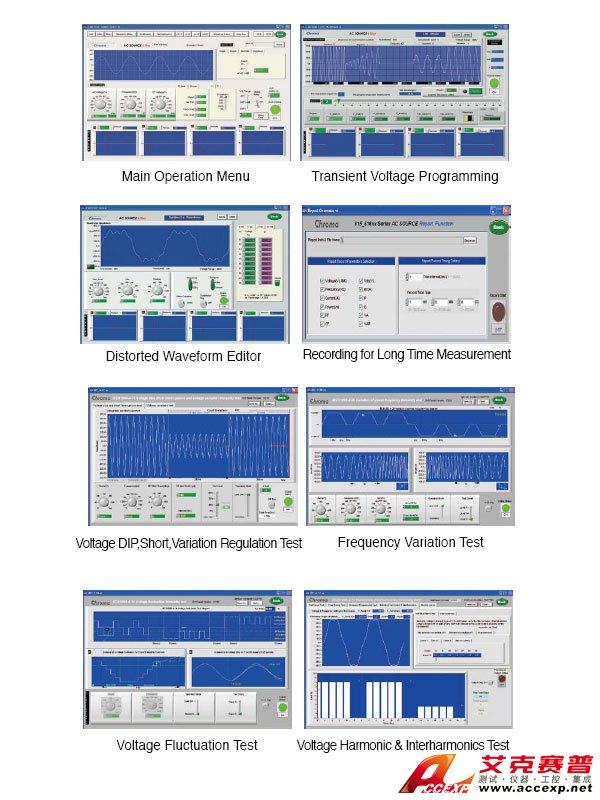 中茂 Chroma 61500 可编程交流电源提供图形化接口的控制软件, 提供简易设定及操作, 可执行所有的功能. 并内建测试法规. 并可以长时间记录量测值, 存成档案供分析.
